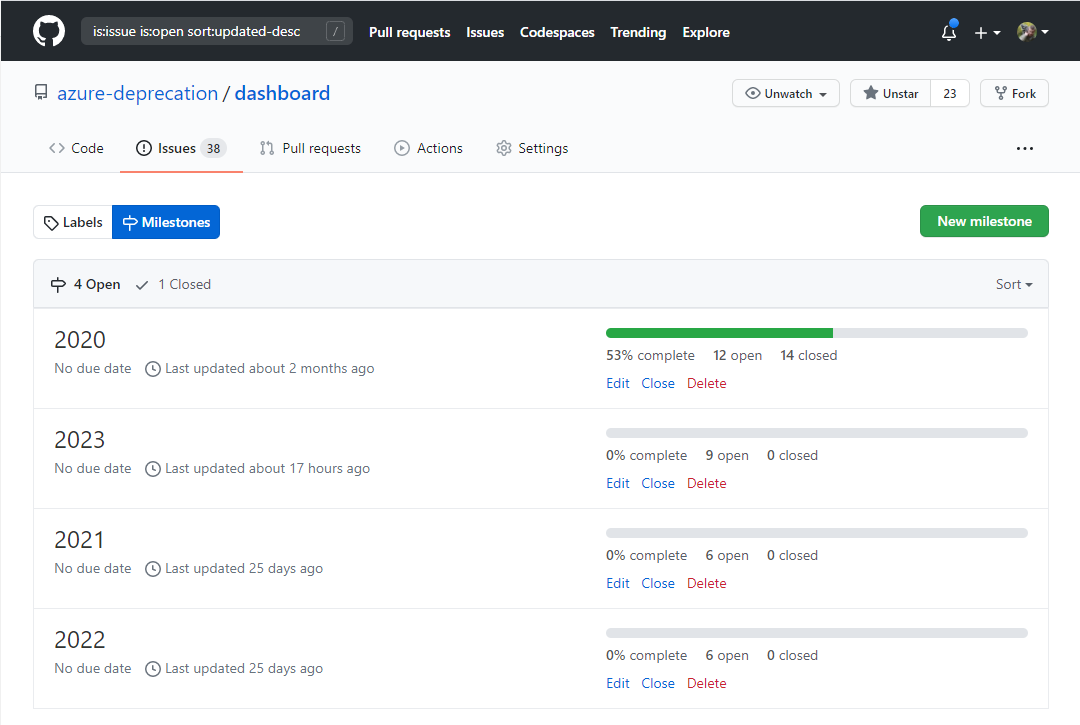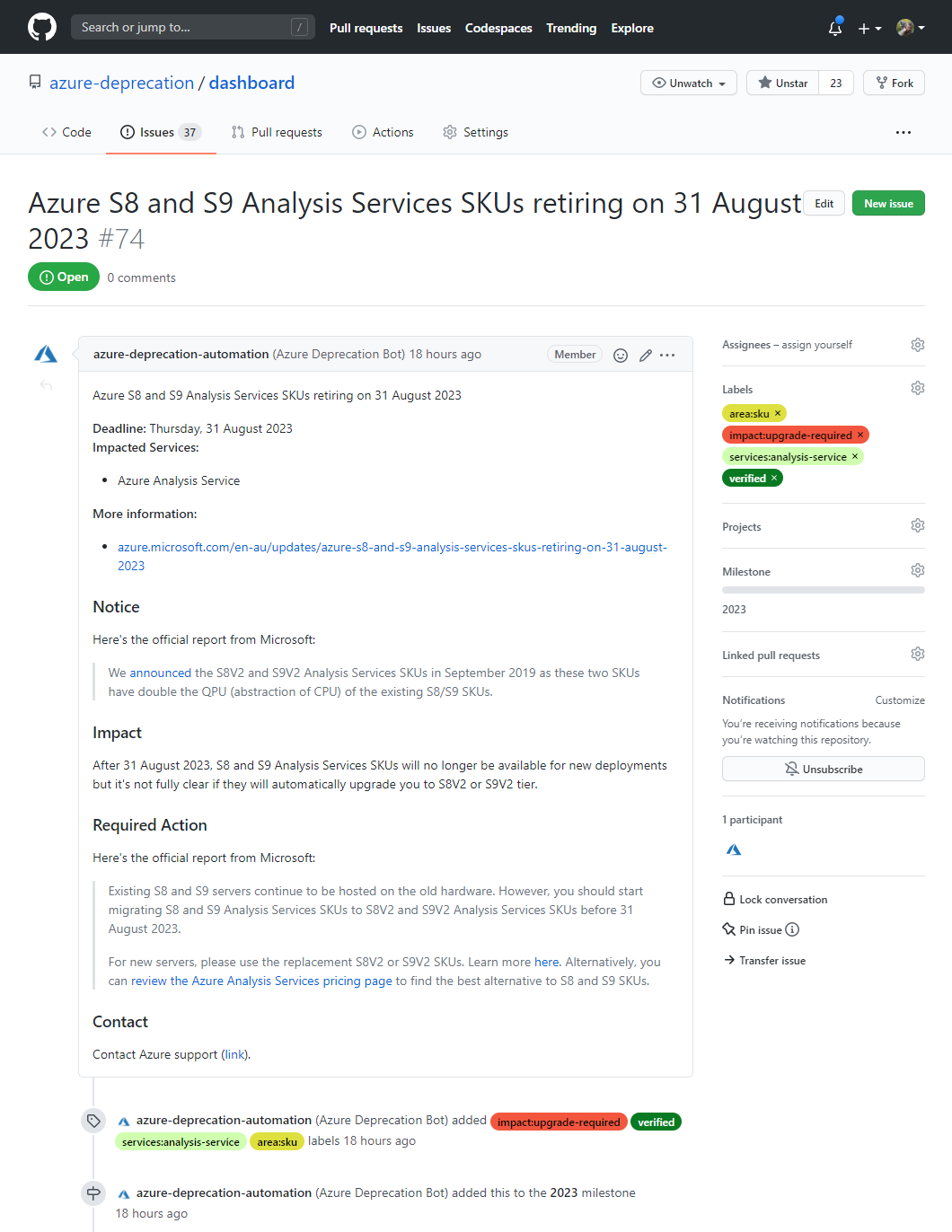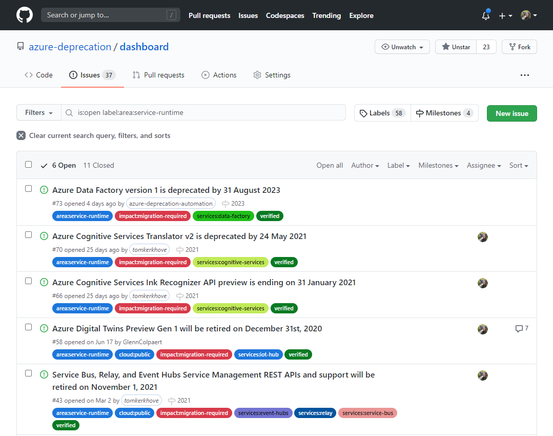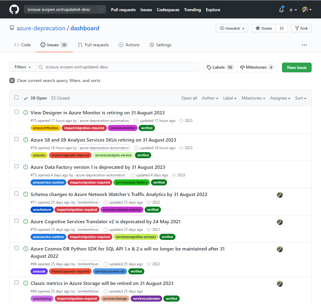 Our Azure Deprecation Dashboard is a public GitHub repo that lists all open deprecation notices, and categorizes them with the impact, area and service to which they apply.