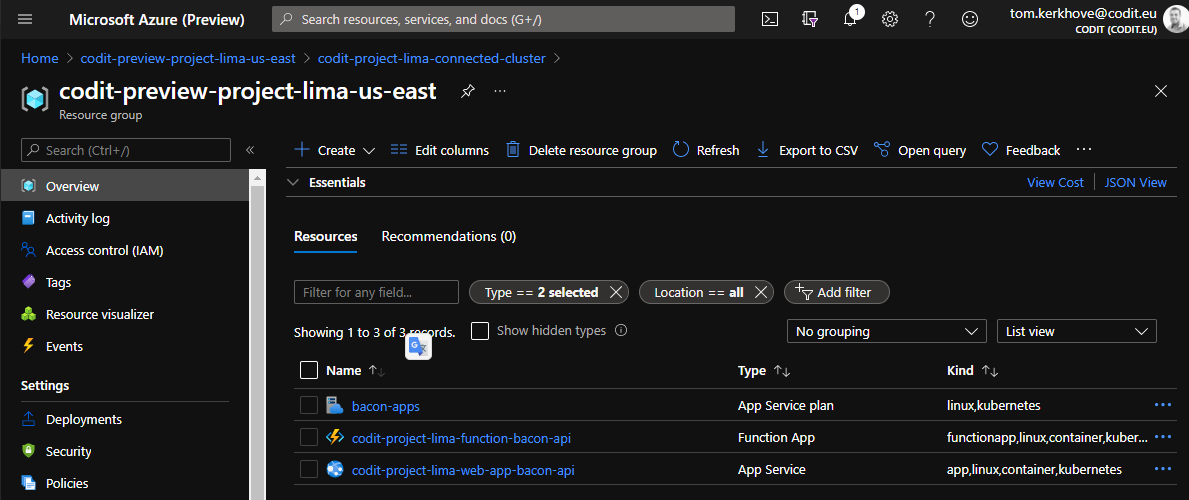 Lastly, if you have a look at the custom location that we have created, you can see the deployed resources in that location: