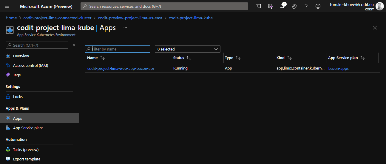 $ az webapp create --resource-group $groupName --name codit-project-lima-web-app-bacon-api --custom-location $customLocationId --deployment-container-image-name ghcr.io/tomkerkhove/bacon-api --plan $appPlanName