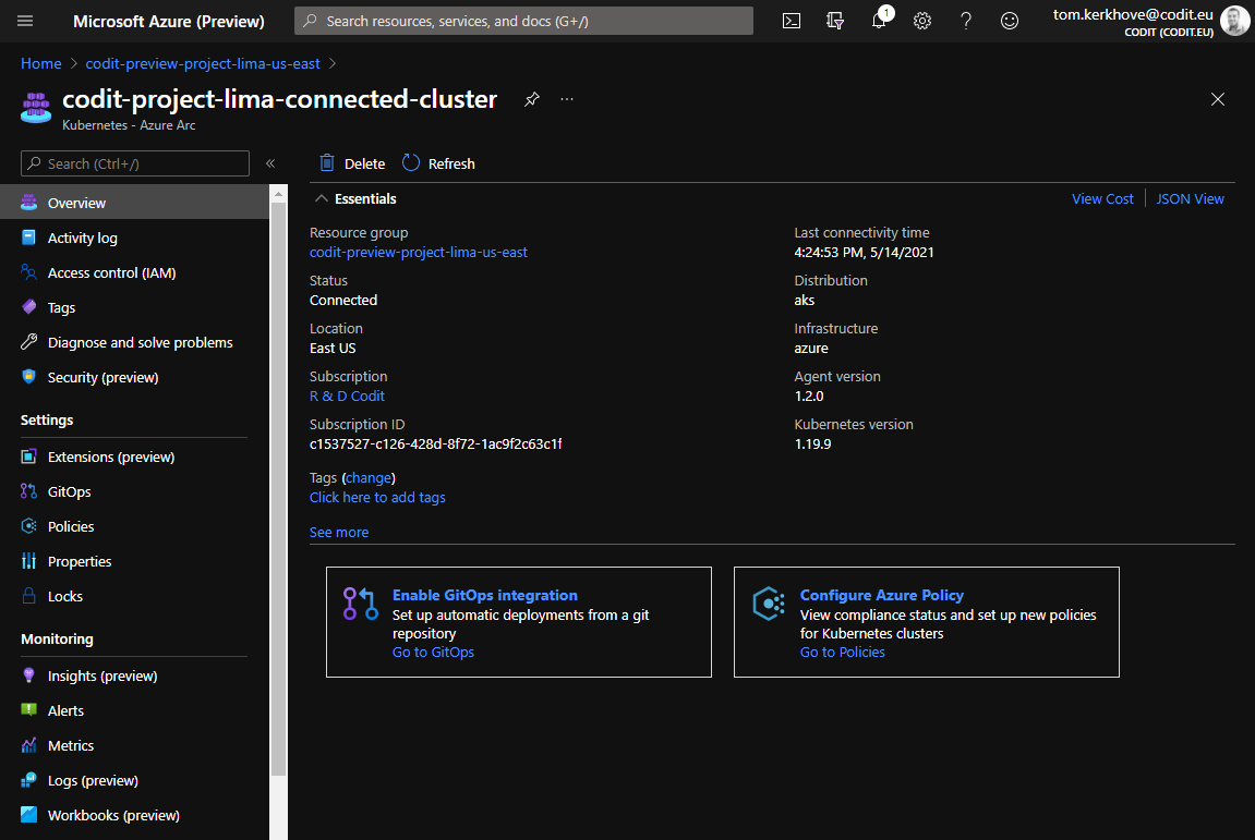 When doing this, it will show an Azure resource in the portal that represents your Kubernetes cluster: