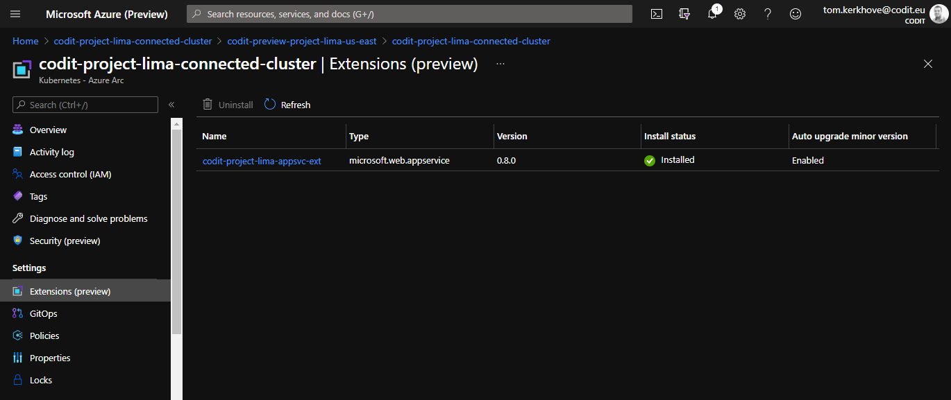 By doing this, it will install the control plane to manage all the resources inside the cluster. Once that has completed, you will see a new extension on your Arc-enabled cluster:
